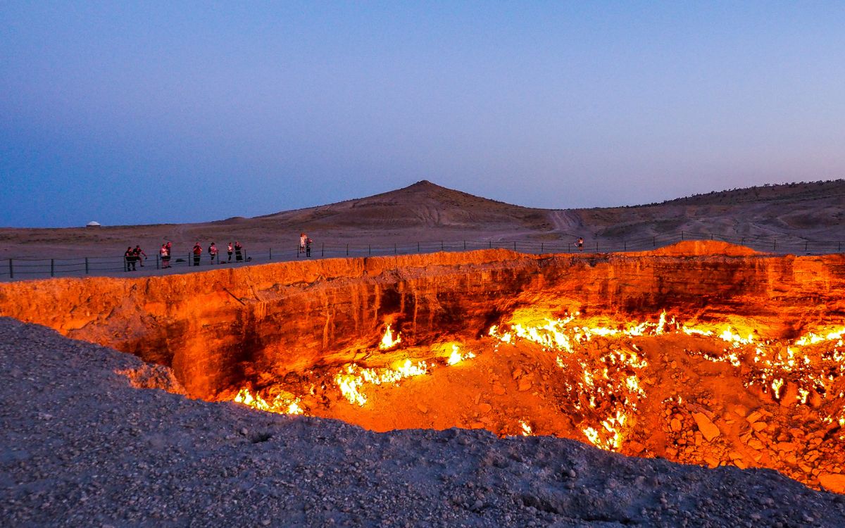 - Cratère de gaz de Darvaza (« Porte de l’Enfer ») : Un immense cratère enflammé dans le désert du Karakoum, brûlant depuis plus de 50 ans.